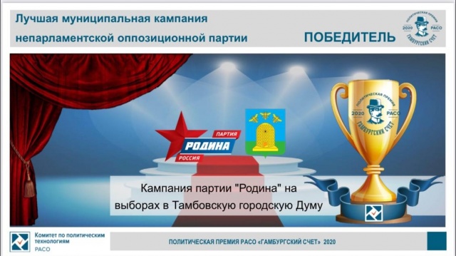 В рамках форума состоялось подведение итогов и определение победителей политической премии РАСО "Гамбургский счет" за 2020 год. В номинации "Лучшая муниципальная кампания непарламентской оппозиционной партии" победила кампания партии "РОДИНА" на выборах в Тамбовскую городскую Думу.