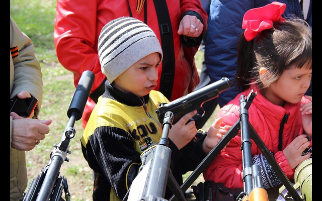 Не меньше радости доставила ребятам выставка стрелкового оружия. Причем оружие разрешили не только смотреть, но и брать в руки и даже фотографироваться. Где еще можно подержать в руках настоящий пулемёт или гранатомет. Выставка вызвала ажиотаж не только у мальчишек и девчонок. С интересом разглядывали оружие папы, мамы и даже бабушки.