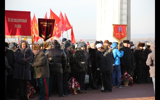 После минуты памяти павших героев, исполнения Государственного гимна Российской Федерации и ружейных залпов почетного караула началась торжественная церемония возложения цветов к Вечному огню у горельефа Скорбящей Матери-Родине.
