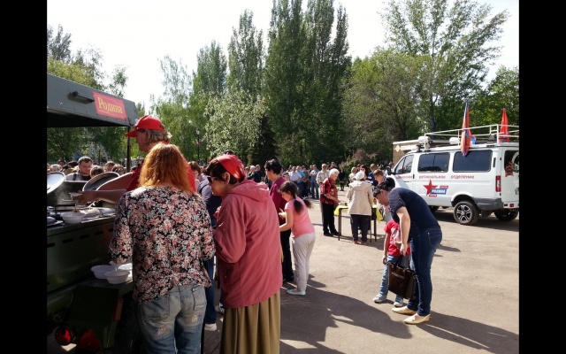 Партийцы чествовали ветеранов, угощали участников праздника солдатской кашей и крепким чаем, приготовленными на полевой кухне "РОДИНА".