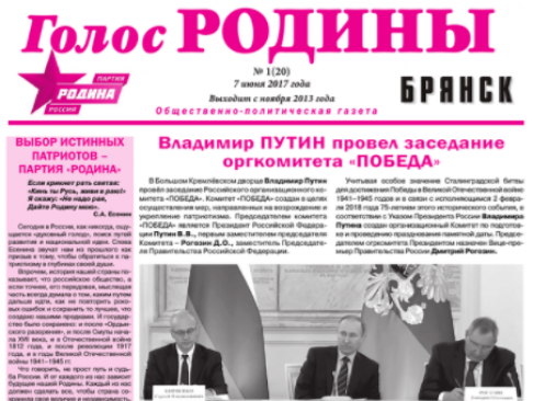 7 июня 2017 года вышел новый выпуск газеты "Голос РОДИНЫ. Брянск".